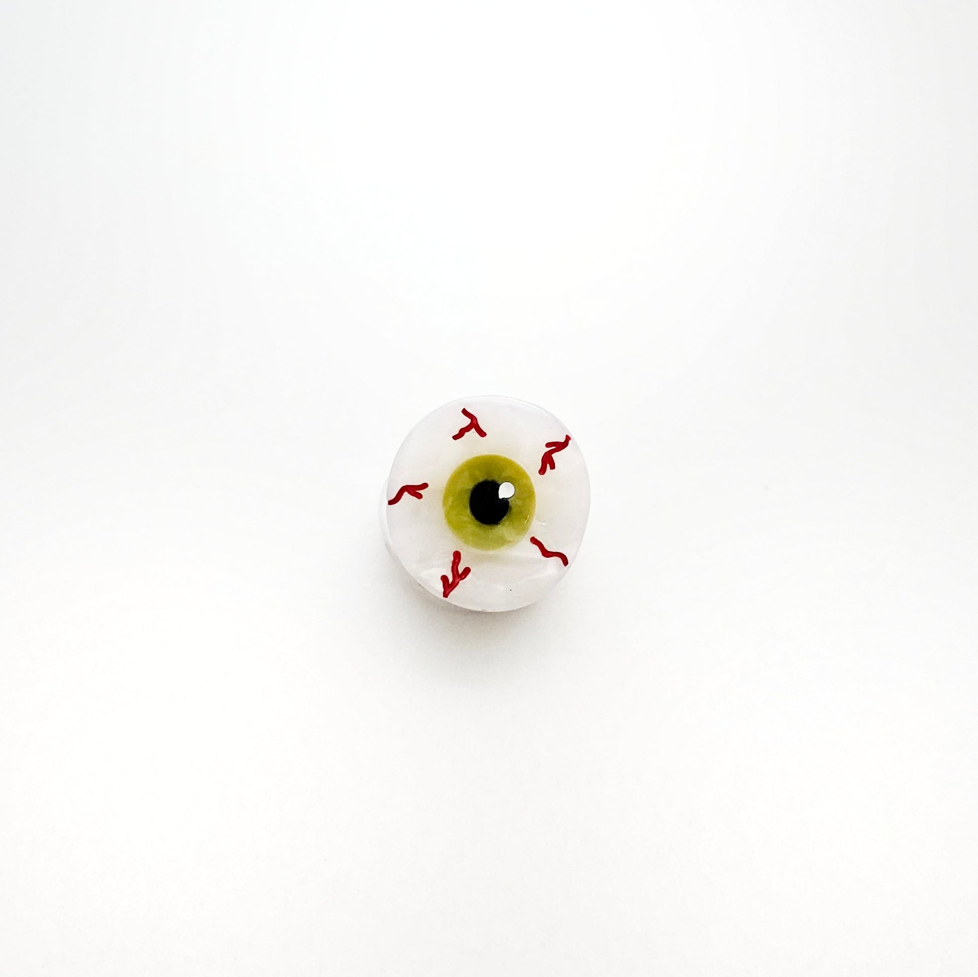 This clip features a pearly round eyeball. The iris is olive green and the black pupil has a painted white shine mark. The white part of the eye has painted red veins.