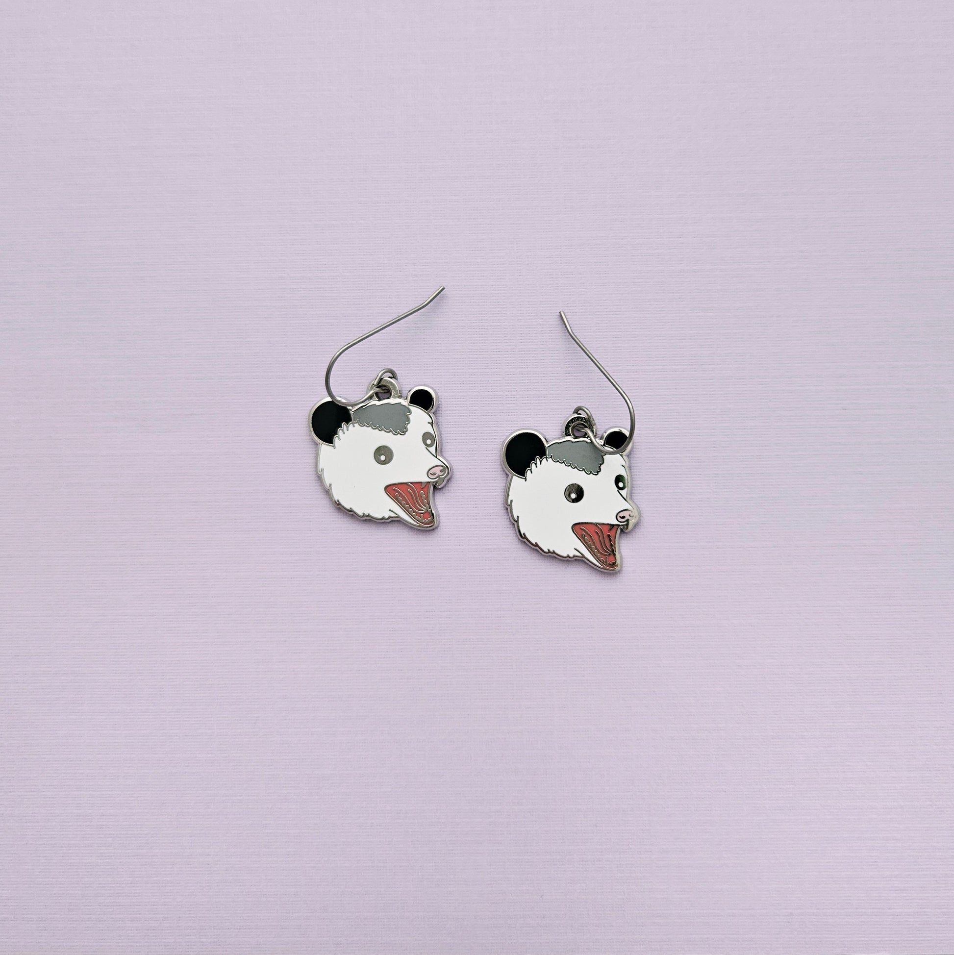 These earrings feature a white, gray, and black opossum head with its dark pink mouth wide open.